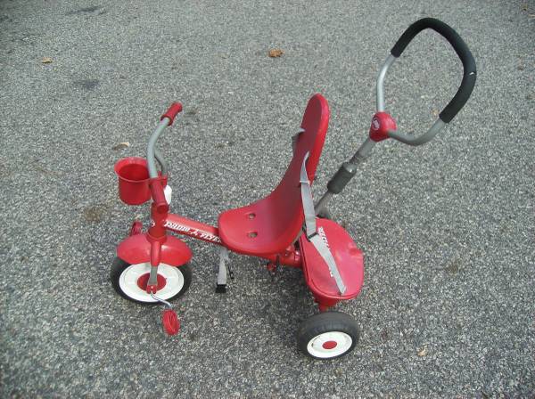 Unique design offers two ways to ride. Our innovative pedal mechanism allows riders to rest their feet on the pedals like a footrest and enjoy the ride while adults push and steer. The push handle then removes for older children who are ready to ride on their own. The trike also features durable, quiet ride tires, an adjustable seat to grow with your child, and a solid steel frame. The fun covered storage bin and chrome bell add fun to the ride.