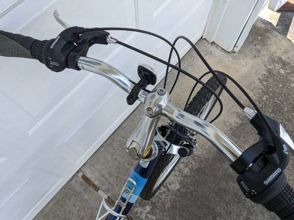 For sale barely used Nishiki step thru aluminum frame, hybrid comfort bicycle with wide mountain bike tires.