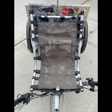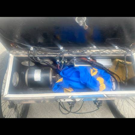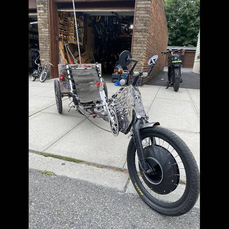 Completely custom built by my Husband . Hand built work of functional art. Zippy and fast E-trike recumbent. Front wheel hub motor and rear chain drive motor. The Lowrider has two chain rings & the rear cassette has either 7 or 8 sprockets. So it’s either a sixteen or a fourteen speed. The bike has a very loud horn system, a Quadlock phone holder, a water bottle cage and excellent disc brakes for quick stopping. Incredible lighting system on this trike also. Very comfortable ride. Cash only.