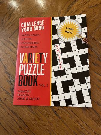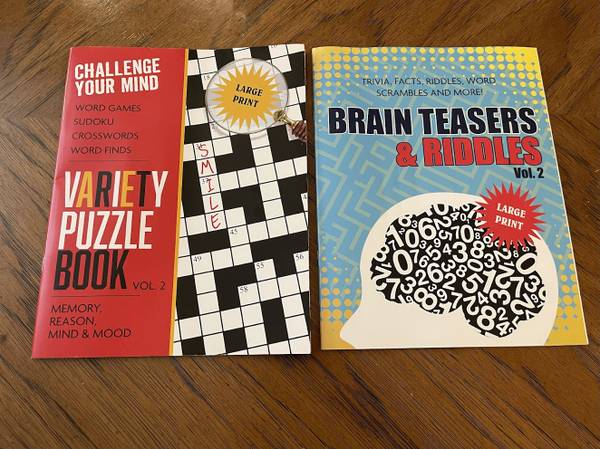 2 Large Print Puzzle Books - Trivia, Facts, Riddles, Word Games, Sudoko, Crosswords Condition: New 23 puzzles in the red book 18 puzzles in the blue book Price: $5.00 (For the pair) Posted by SSL1111