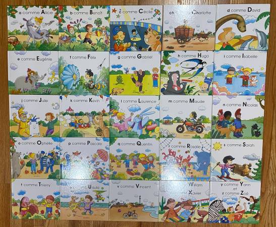 French hardcover books that cover all 26 letters of the alphabet + a book for “CH” + a paperback guide for parents. All 26 books are in French language and are designed to assist a child or adult in learning to read the French language. All books are in very good condition. Author is Dominique Foufelle and published by Hachette. Each book sells on Amazon for at least $4 plus tax and some are difficult to find at any price. Shipping is available upon request.