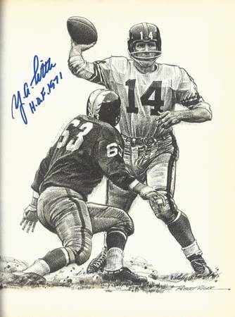 .. Yelberton Abraham Tittle Jr. (9/24/1926 - 9/8/2017), better known as Y. A. Tittle, was a professional American football quarterback. He played in the National Football League (NFL) for the San Francisco 49ers, New York Giants & Baltimore Colts - after spending two seasons with the Colts in the All-America Football Conference (AAFC). Known for his competitiveness, leadership & striking profile, Tittle was the centerpiece of several prolific offenses throughout his (17) year pro career (1948-1964). With the Colts, Tittle was named AAFC Rookie of the Year (1948), after leading them to the AAFC playoffs. After consecutive one-win seasons, the Colts franchise folded - which allowed Tittle to be drafted in the NFL, by the 49ers (1951) . Through (10) seasons in San Francisco, he was invited to (4) Pro Bowls - led the league in touchdown passes (1955), and was named the NFL Player of the Year (1957). Tittle was part of the 49ers' famed "Million Dollar Backfield" - was the first pro football player featured on the cover of Sports Illustrated, and is credited with having coined "alley-oop" as a sports term. Considered washed-up, the 34-year-old Tittle was traded to the Giants following the (1960) season. Over the next (4) seasons, he won several individual awards, twice set the league single-season record for touchdown passes, and led the Giants to (3) straight NFL championship games. Although Tittle was never able to deliver a championship to the team, his time in New York is regarded among the glory years of the franchise. He was inducted into the Pro Football Hall of Fame (1971).