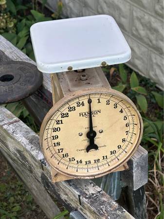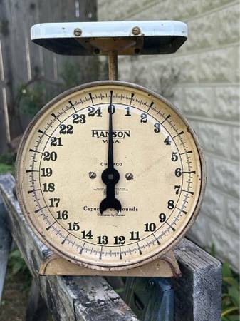 This vintage Hanson Scale from Chicago is designed to measure items in ounces with a maximum weight capacity of 25 lbs. Made in the United States.