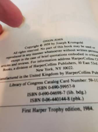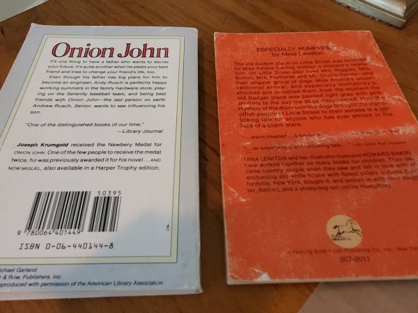 Onion John by Joseph Krumgold - First Harper Trophy Edition, 1984 Especially Humphrey by Mina Lewiton - First Dell Printing, March 1969 $1 each - Click on "more ads by this user" to see other books...