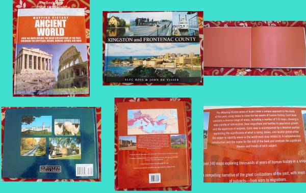 Good used clean condition. 2 Piece book lot (one really huge 14 1/4" high by 11 1/2" Hardcover Mapping History Ancient World book and one 12 1/4" wide X 9 1/4" approx. high Kingston and Frontenac County book (Ontario, Canada).