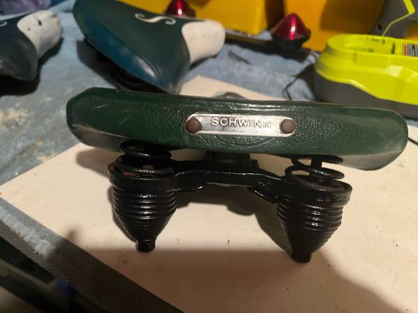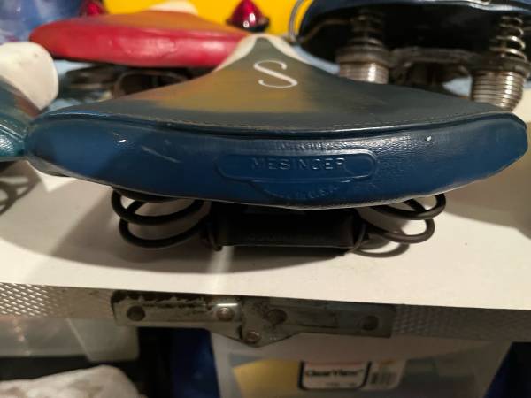 Schwinn and Messinger bicycle seats- Various prices see below 1 Red Messinger 9” seat with hardware no rips-$25 2 Blue Schwinn messinger 9” S seats with hardware -$30 each 1 Green Schwinn beehive...