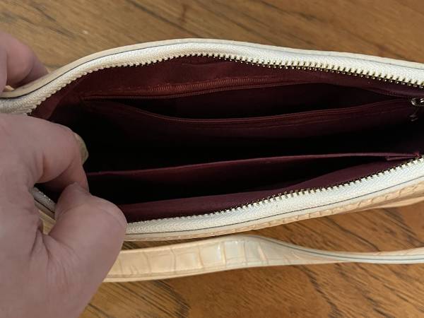 Main closure is a zipper. Inside has one zippered compartment and one open compartment in addition to the main compartment.