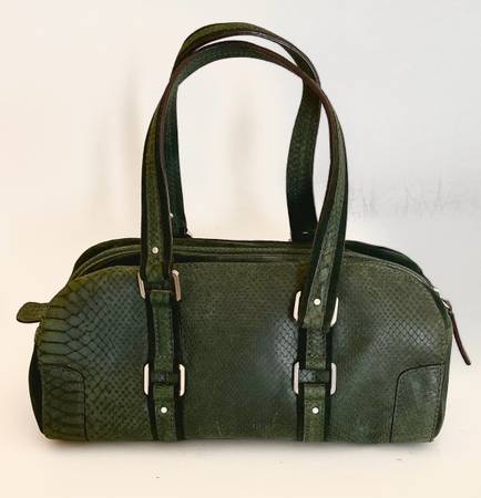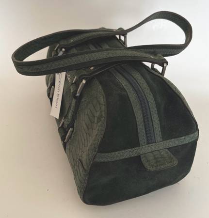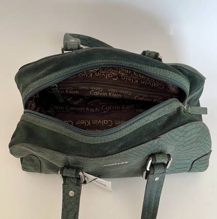This is a CK vintage Fall/Winter Season handbag. I would say this is like a dark olive green color with an alligator textured leather. It has a top zipper closure. It has a Calvin Klein text interior with 1 zip compartment and 2 pouch pockets. If interested in purchasing, we can meet by the Walmart in Flanders/Target in Hackettstown. Just pick a day Monday through Sunday 10 AM - 4 PM.
