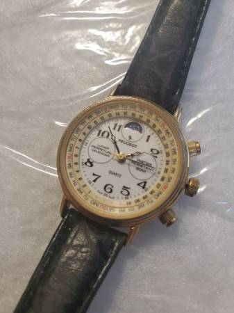 Add a touch of sophistication to your wrist with this vintage Peugeot wristwatch. This classic piece features a black on white dial with Arabic numerals.