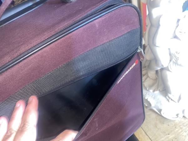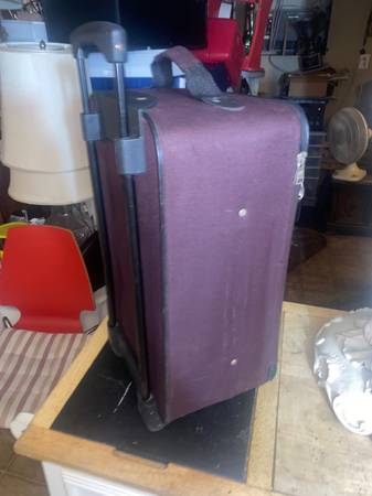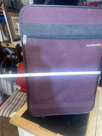This is a good size carry on luggage bag in a murine color. It's Avantgarde brand and has good room in the main compartment with a zipper area in front. Pull out handle two large wheels that works great. . Overall in good condition and just a normal bag. This is an older model bag compared to todays now must of the bags come with 4 wheels but more money. Measures 21 inches high with wheels to top and 19 inches high just bag plus 14- 9 long and wide. Email or text me with any questions.