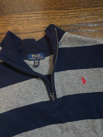 Polo Ralph Lauren half-zip rugby shirt in navy and gray stripes with the red embroidered pony logo on the chest. Size XL (18-20).