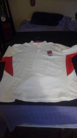 Men's Rugby Jersey / Shirt - England Rose (White w/ Red Rose). This jersey is brand NEW with tags still on it, but didn't fit me right. The label says 3XL, but realistically it fits like a 2XL TRIM fit - especially through the torso area - otherwise it is generously cut. I attribute the difference in fitment to the European sizing. Heavy-duty and well-made! White with Red gussets under the armpits and embroidered Rose logo. Please text me with any questions!