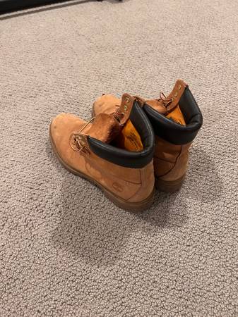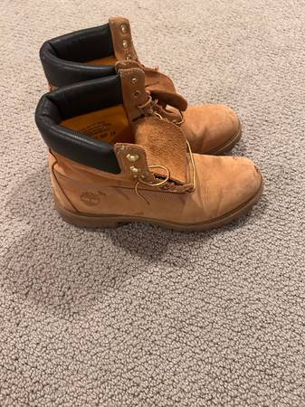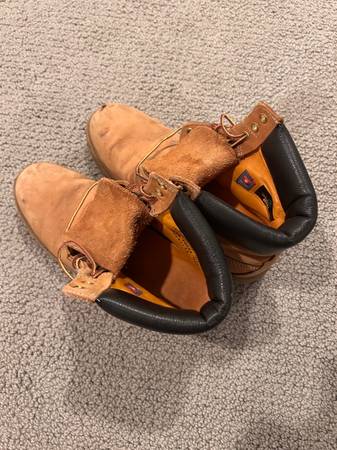 Timberland tan lace-up boots, work/hiking style with padded collar. Still solid with normal scuffs but no major damage.