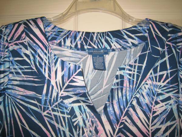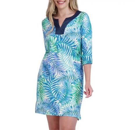 75% OFF: NEW Caribbean Joe Tropical Print UPF 50+ Dress/Cover Up w/3/4 Sleeves & Split Neck. New with Tags. Size Medium. 36” length, machine wash, tumble dry. Fabric: 90% polyester & 10% spandex. New, never worn. Retail $60. NOW: $15. Photos of same style Caribbean Joe Dress in a tie dye & green pattern to show how it looks on model.