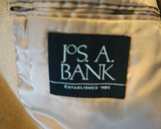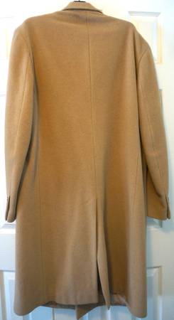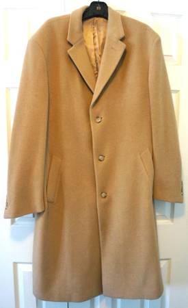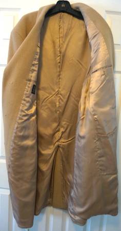 REDUCED from $120. Jos A. Bank Single Breasted Camel Hair Overcoat Size 42L. Used, in good condition. Small rip at bottom of pocket; pin hole on shoulder, both easily repairable. (See photos.)