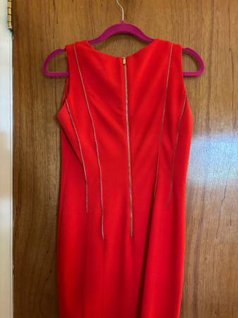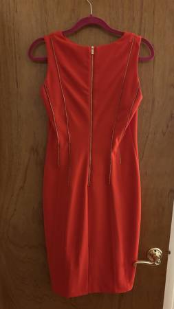 Calvin Klein dress, size 6, sheath, orange with gold "zipper" accents, worn one time, like new easy driveway pick up