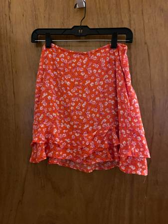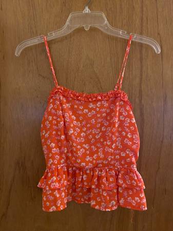 Two piece ruffled dress adjustable straps, flouncy skirt and top, floral orange and white, fully lined, worn once easy front porch pick up