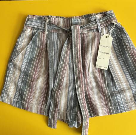 New with tags, Woman's shorts,striped, cotton/poly blend, Medium, belted, pockets, elastic waist, easy front porch pick up