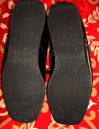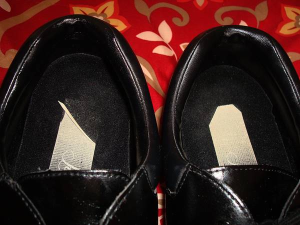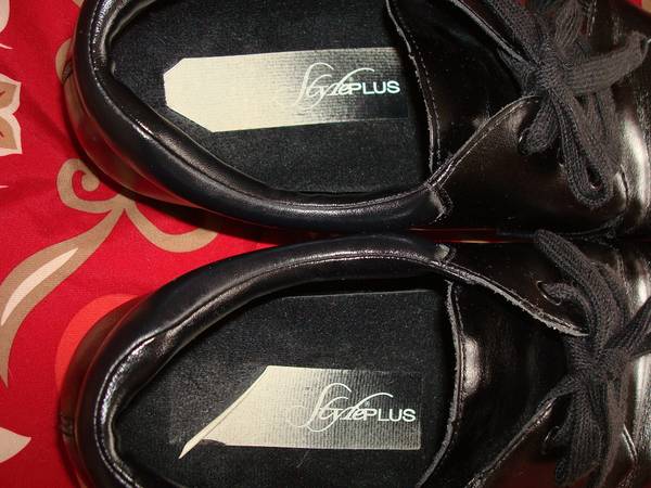 No smoking premises, clean preowned shoes with some creasing, high shine BLACK shoes, black sole. Some debris on bottom of sole, with GOOD dimpled tread - sole looks excellent preowned condition. Some fuzzies inside shoe, one label (style plus) is folded up as you see in photo. Some light scratches that you cannot see over 3 feet away. Will be photographed well, checked for odors by licensed shoe inspector and his 3rd party notary. He is used for prevention of false claims and potential fraud. There are 3-4 rows of creasing in top of foot area on the shoes. They are not noticeable when one is on stage or marching in the field. Good cushion sole inside shoe. Cleaned with CLOROX wipes inside shoe. See close up photos and notes details on photos. NO BOX IS INCLUDED. BOX FOR REFERENCE ONLY. Shoes have been UV microscopically stamped by LICENSED shoe insp.on inside of shoe for prevention of someone shipping back falsely purchased shoes.