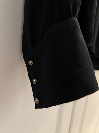 Color: it is a standard solid black color as seen in the main picture. Any color differences from picture to picture are just from my camera and not the actual blouse.