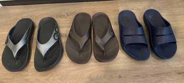 I am selling all three for $99. Please keep in mind that these are USED. Men’s slide sandal- navy size 9 Men’s oOriginal sandal- brown size 9 Men’s oOriginal sandal- graphite size 9