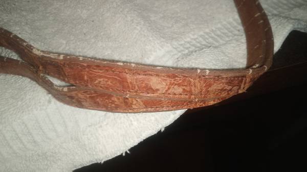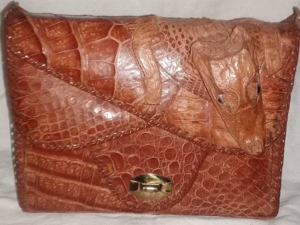 The image displays a vintage handbag made from genuine alligator or crocodile leather, featuring the head of the reptile on the flap.