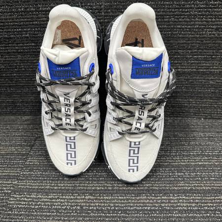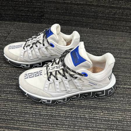 The Trigreca trainers bring innovation to the brand's ever-evolving aesthetic. Three-dimensional Greca executions on the soles offer an impactful landing with the "Greca Cushioning System." In a subtle nod to Versace's home city, the uppers have a discrete print of Milan's coordinates.