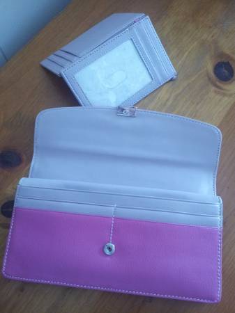 Womens Genuine Leather Pink Double Snap Multifunctional Expandable Trifold Wallet featuring pull out fold out card holder in excellent condition. Very hard to find wallet in this style and color. Features an expandable zippered coin purse! The wallet measures 7.5" long x 4" high x 1" wide. The outside has a large zipper coin purse in the back and many compartment inside including numerous slide compartments and a magnetic top closure.Cash only. Pick up only in Guttenberg, NJ 07093. Thanks!