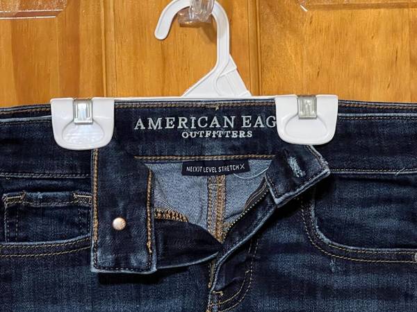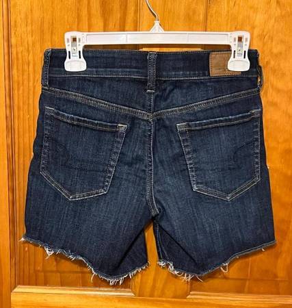 Womens American Eagle Dark Wash Next Level Stretch X Midi Denim Shorts Size 0, selling for $15.