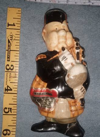 VINTAGE DRIOLI BAG PIPER MINIATURE BOTTLE CHERRY WINE LEFT FOOT WAS BROKEN OFF AND GLUED BACK SMALL CHIP ON BACK RIGHT FOOT Bottom is stamped: "1969 Exclusive Drioli Made In Italy" "more ads by this...