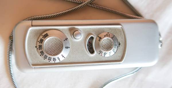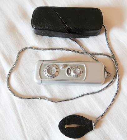 Minox B Camera with Dark Brown leather case and Minox Light Exposure meter with red leather case, both with measuring chains and like new condition.