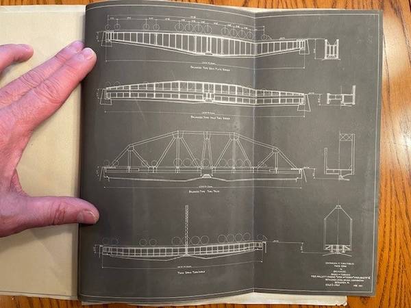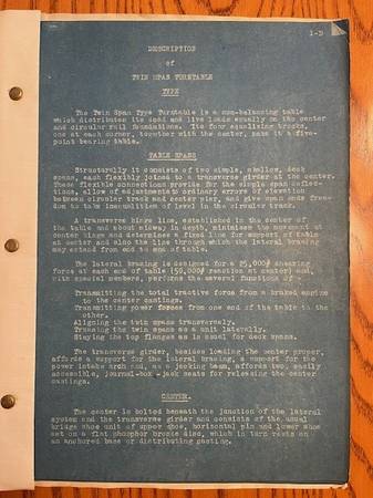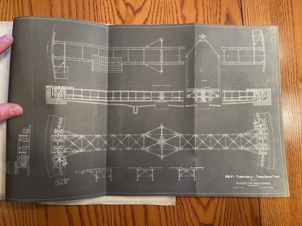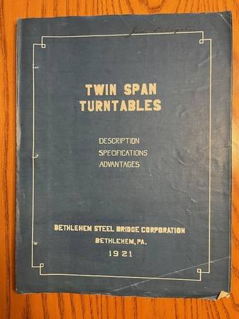 Twin Span Turntables (Railroad): Description, Specifications and Advantages produced by the Bethlehem Steel Bridge Corporation, Bethlehem, PA dated 1921. Publication is in reverse blueprint blue color pages with a linen type front/rear cover. Pages are numbered 1D - 5D for Description section; 1S - 5S for Specification section; 1A - 4A for Advantages section; and 1C - 5C for Costing section. Publication includes two fold out plans: one depicting a comparison of turntables Twin Span vs. Balanced; and the second fold-out is a plan and profile of a standard 100Ft. Turntable - Twin Span Type. Publication is 8 1/2" x 11" in size. Excellent general overall condition. $30.00 cash payment at local pick-up only in Blairstown, NJ