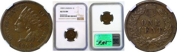 1909 S INDIAN CENT, CERTIFIED AS GENUINE, ENCAPSULATED FOR SECURITY AND PROFESSIONALLY GRADED BY NGC (NUMISMATIC GUARANTY COMPANY). THE COIN IS GRADED AU (ABOUT UNCIRCULATED) WITH A GRADE SCORE OF 55 OUT OF 60.