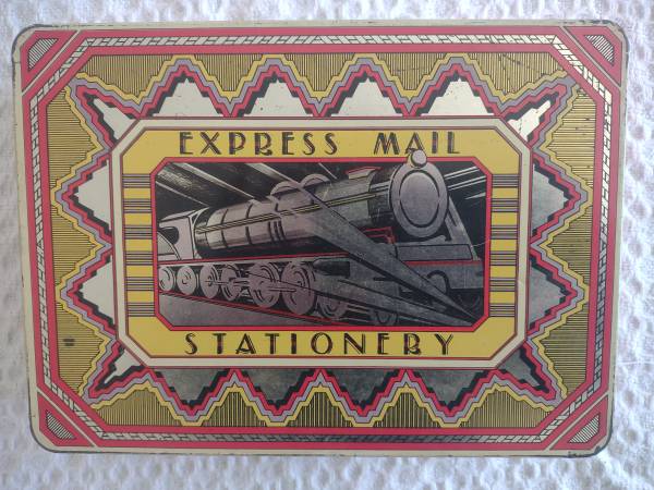 Tin box with an art deco vibe. Vibrant colors. dimensions 9.25" x 6.5" x 2" If you see this ad the item is still available.