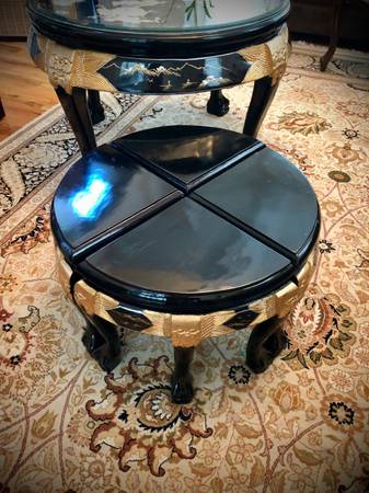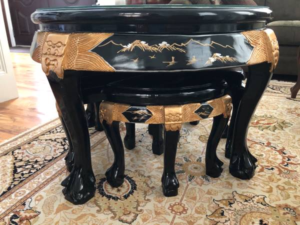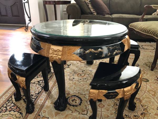 For sale is a vintage, hand-carved, hand-painted Asian Chinoiserie round coffee or end / side table with 4 small stools that tuck neatly underneath the table!