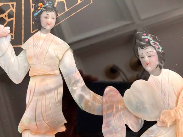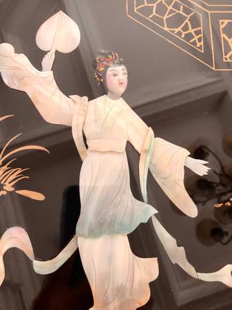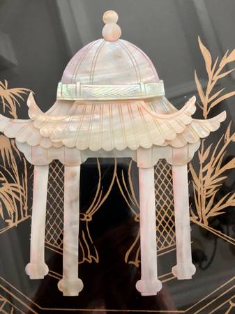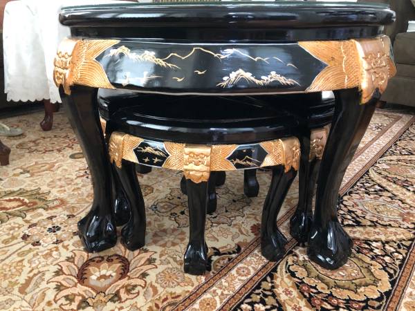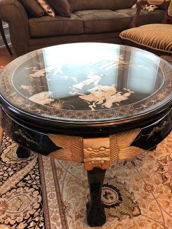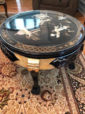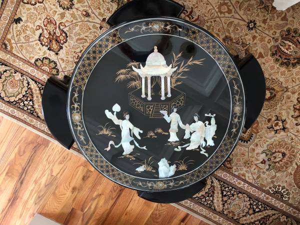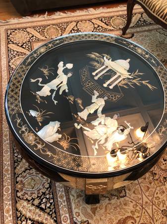 The custom glass top of the table protects the handcrafted mother of pearl figures which are recessed. Black lacquered solid wood with gold leaf accents, in very good condition.