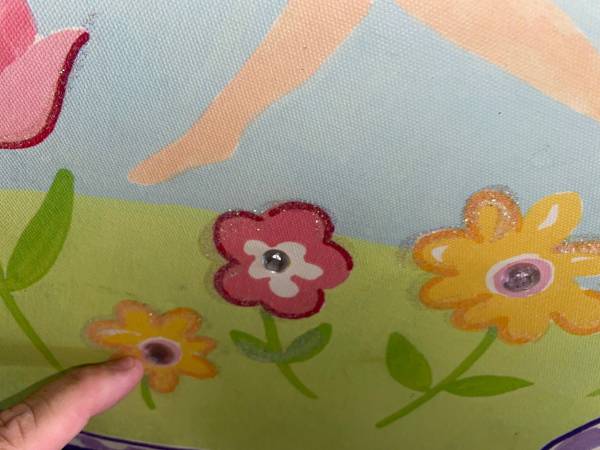 The picture is a print and has glitter and gems that come out the flowers for a sparkle design as well as the colors of the picture. I would say more for a girls room or a magical themed look. Email or text with any questions.