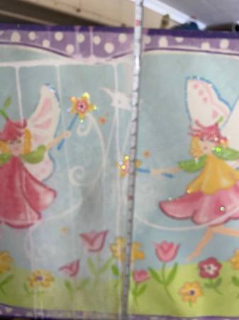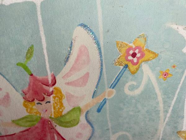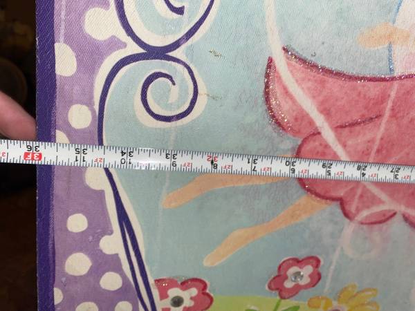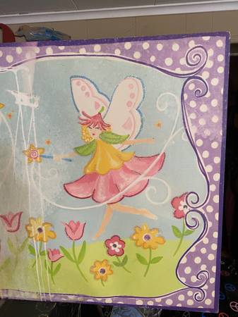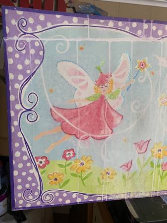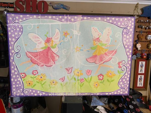 This is a Big size 36 by 24 inches Childs room Picture for the wall which is a print. It's very colorful and I'm guessing it's from inside the house looking out a window at the Two fairies in the yard.