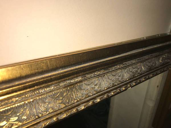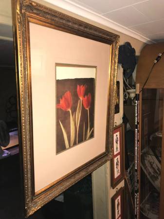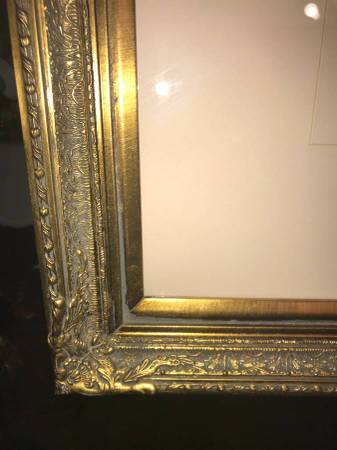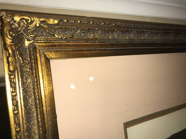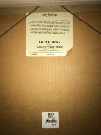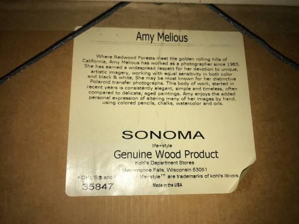 Good size matted real glass framed photo drawing by Amy Melious called Sonoma. This was sold years ago in Kohl's for 100 dollars and price is still in back as well as tag about the picture. The gold color frame is beautiful designed and says genuine wood product on tag as well. 30 1/2 High by 26 1/2 Long all together and ready to be hung. The picture itself has slid down about two inches in middle and very easy to slide back up when you take back off. I've done it many times to other pictures. This back is still original tape on back so I didn't want to disturb it and left it for buyer to do. Someone might to take picture out and put new one in so you choose.