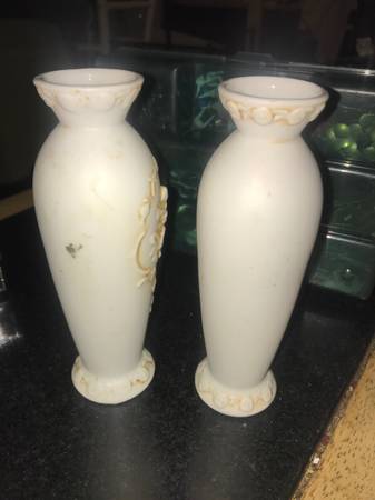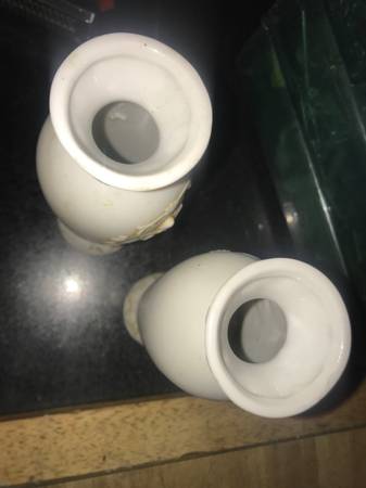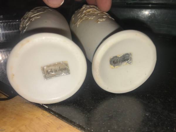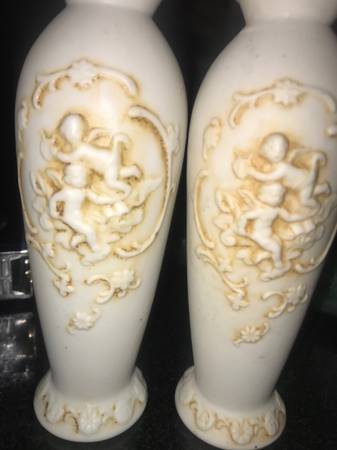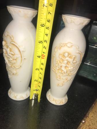 This is for both of these vintage matching pair of vases made in JApan. They are porcelain and have angels or cherubs in front of them popping out of the vases. They would be from around the 1960s era and measures 6 1/2 inches high 2 1/4 inch thick. They are in excellent shape no chips or cracks. I didn’t clean them in anyway in case that can ruin any value. Email or text with any questions.