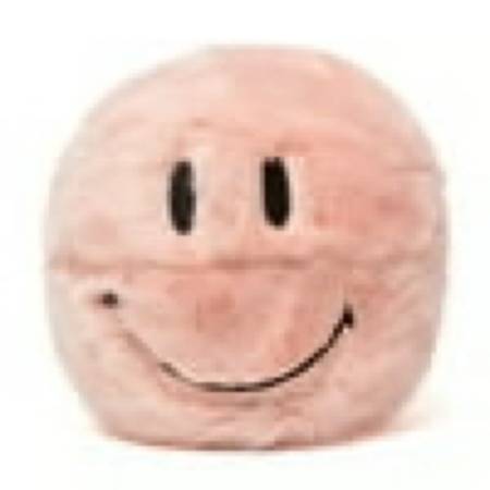 MARKET Smiley Fur Basketball in pink. It is a plush, decorative item created in collaboration with the Smiley brand