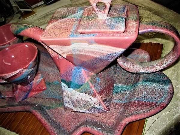 Decorative Teapot Unique Design Set With Tray And Two Cups Matching tray 21"x 14" Teapot: 12"x 7 1/2" 2- Cups: 5 1/2"x 4"