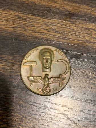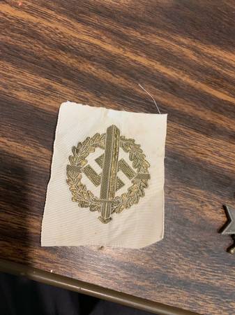 SA bronze cloth Sports Badge $100 1934 Tag Der Arbeit Workers Badge Brass $100 Police Tinnie $100 [wreath] (Pretty good shape, haven't seen one like this in a long while) I also have a flag...