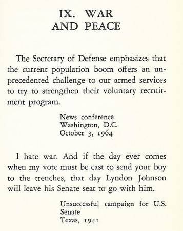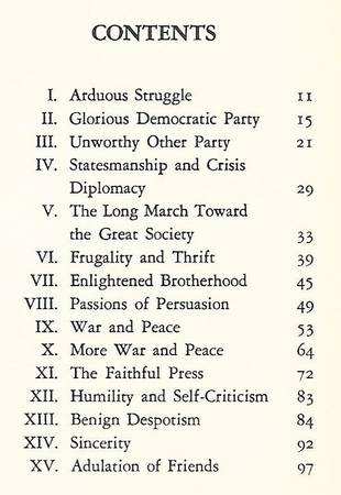 "These quotations have been taken from the speeches, musings and digressions of Lyndon Baines Johnson. Their date and source are noted for reference. No effort has been made to rework these heroic thoughts into grammatical English. Let workers, peasants, students, housewives and Republicans study, memorize and digest the exhortations of Chairman Johnson. Let little children add their tiny voices to public and private recitations of these joyous inspirations."