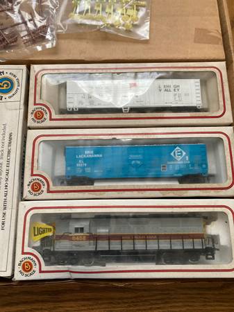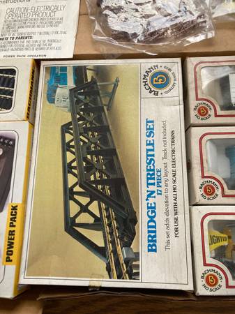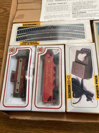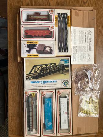 Must take will not sell separately. Never used in boxes. 8 pieces. Bridge and trestle. HD Simplimatic plug in wiring. HD & N power pack. Caboose 43-1007-G4. Hooper 43-1006-K4. Box car...