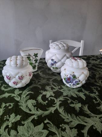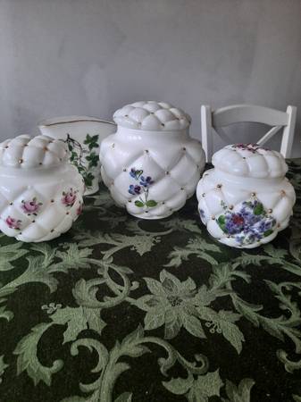 Vintage Consolidated hand painted biscuit jars and vase. $20 each for smaller jars, $30 for larger jar, $10 for vase. Offers considered. Cash and pickup. Call number posted.