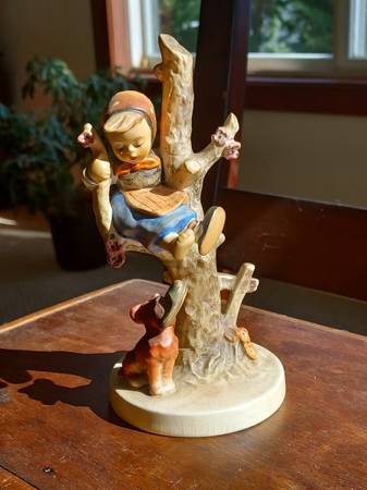 This vintage circa 1960 porcelain figurine is a hand-painted work of art depicting a little girl in a tree and a puppy with a shoe in its mouth. It's trademark is TMK-3. There is no cracking or hazing present. The back of the base is signed "M.J. Hummel."