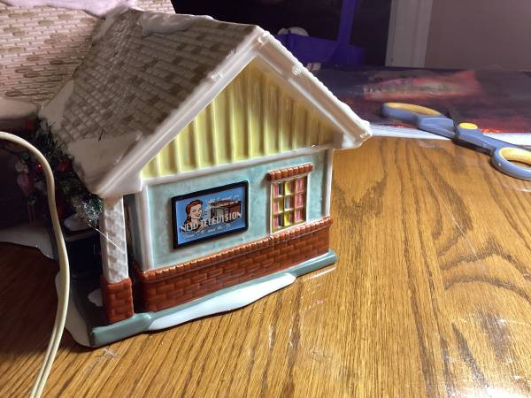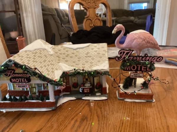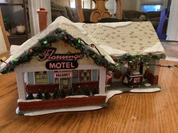 The original cord for the inside light and sign doesn’t work but you can add your own light cord to the inside opening bottom of the piece as shown in the last photo. The decorative green and red Xmas lights on the motel and flamingo sign are non functioning. I have added my own set of Lemax mini battery operated lights going across the motel and onto the sign and works just as well if not better. I have included these with the motel. There is a video. You can also use any mini light of your choice as well if you wish to change it up and add your own touch. There are no cracks, chips, or broken pieces. Other than the lights nothing else is wrong with it you just need the light cord with bulb.