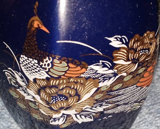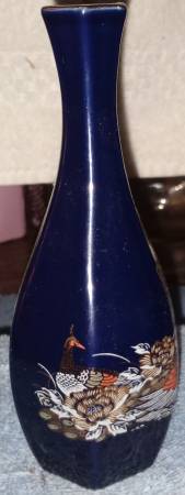 Vintage Japanese Kutani-style bud vase, likely made of porcelain, featuring a blue background with intricate gold and colorful designs, including a peacock and floral patterns. Blue w/ Slightly Hexagon shaped and gold trim on the lip.