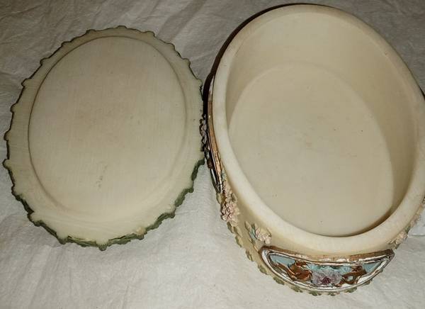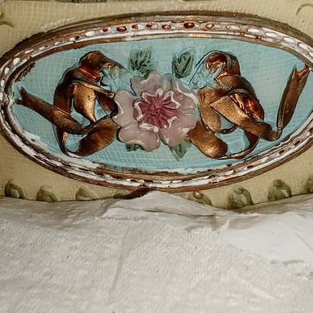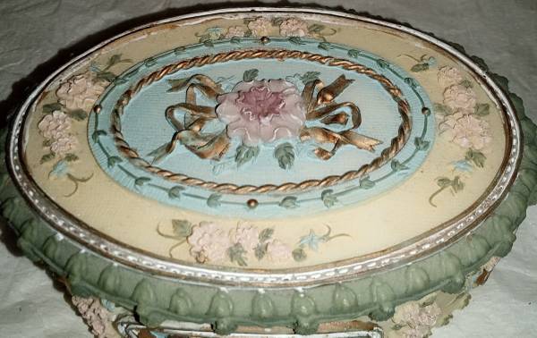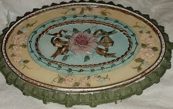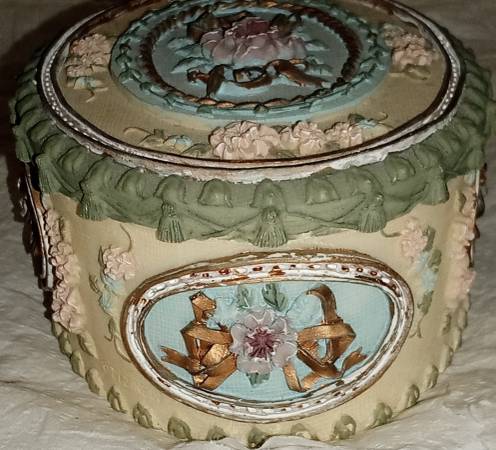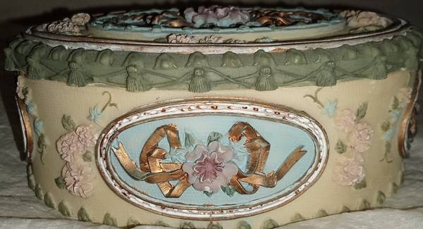 Features a decorative, possibly Victorian-inspired, design with floral motifs, ribbons, and tassel. Designed for storing small items like jewelry or other keepsakes. 5"* 3 1/2" *2"